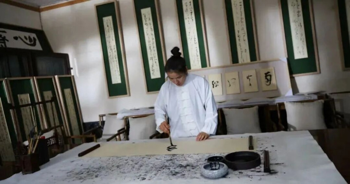 张伟丽练羊毫字、打太极(图源张伟丽微博)